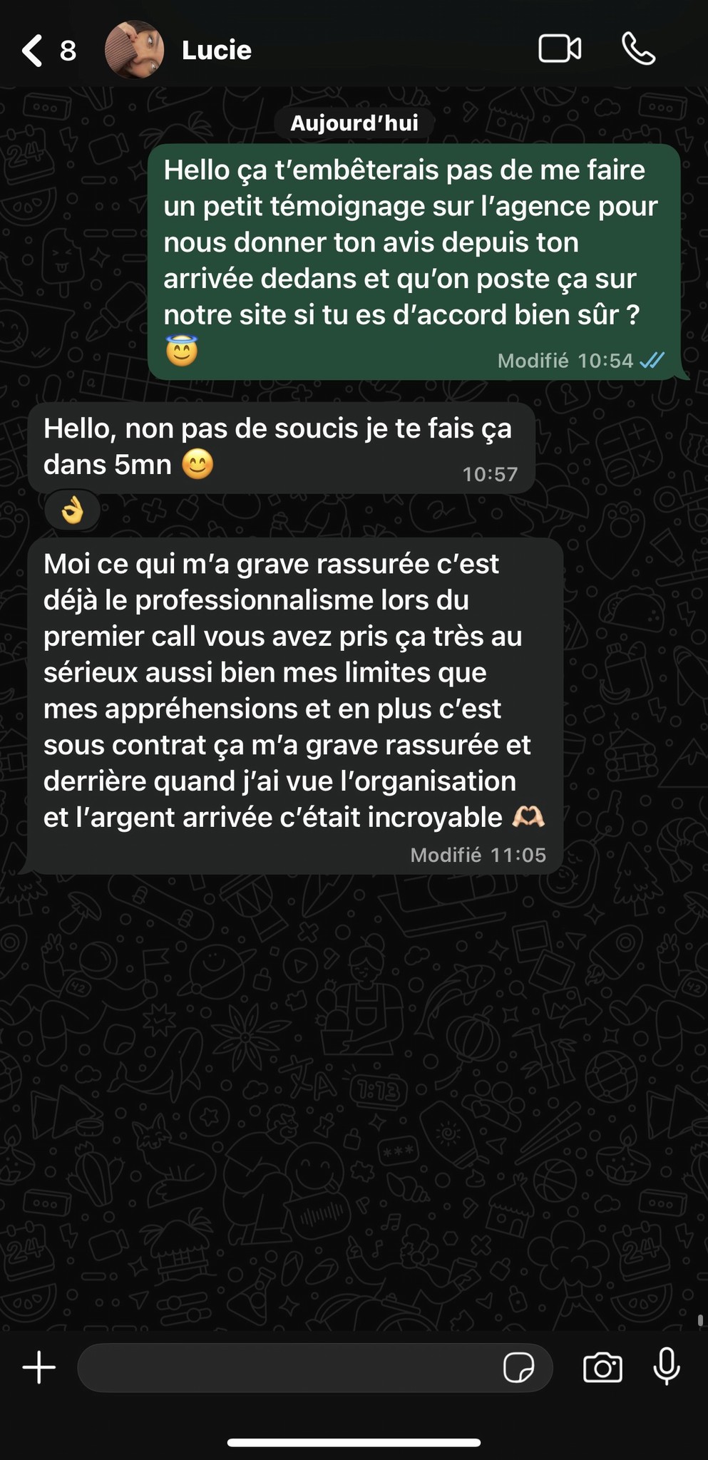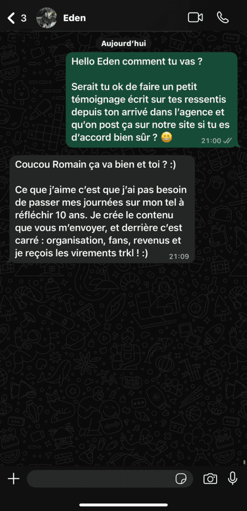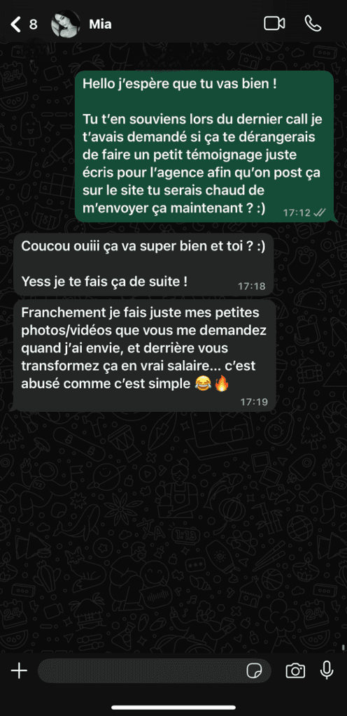 Avant : Elle travaillait en restauration, sans vraiment savoir quelle direction donner à sa vie. Aujourd’hui : En seulement 1 an chez Kairo Agency, Emma a généré plus de 135 000 € grâce à OnlyFans. Avec notre accompagnement (contenu, stratégie, community management), elle a transformé son quotidien et vit désormais en toute liberté.